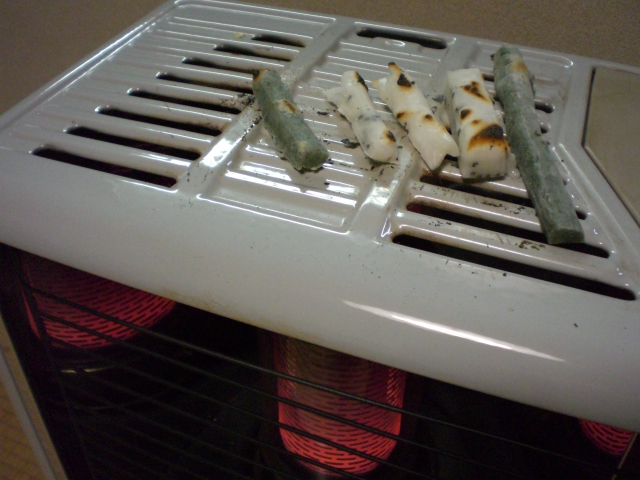 香ばしいにおいがしたら、帳場でもち焼き中です。
