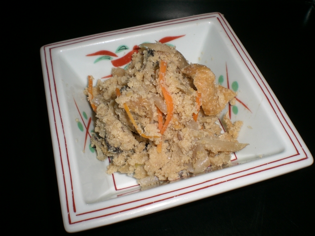 おからで作った田舎家庭料理「きらず」。どんなものか?と問い合わせがありましたので。こんなんです。今日は環翠楼のまかないとして出てきました。 ごぼうはささがき、にんじん、糸こん、油揚げ、しいたけは細切りに。だし汁に砂糖、醤油、少しのみりんと少しのお酒を入れた中に切った具を入れて煮詰める。汁が残っている間におからを加えてよ~く混ぜ合わせる。しっとりしてて美味しいんです。