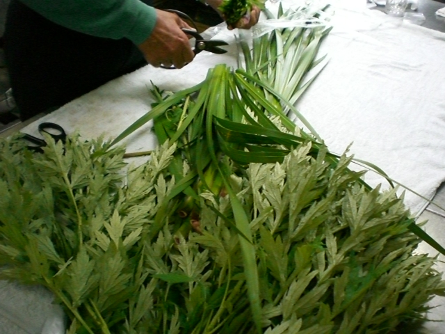石本さんが菖蒲の葉と餅草の葉を刈ってきてくれ、