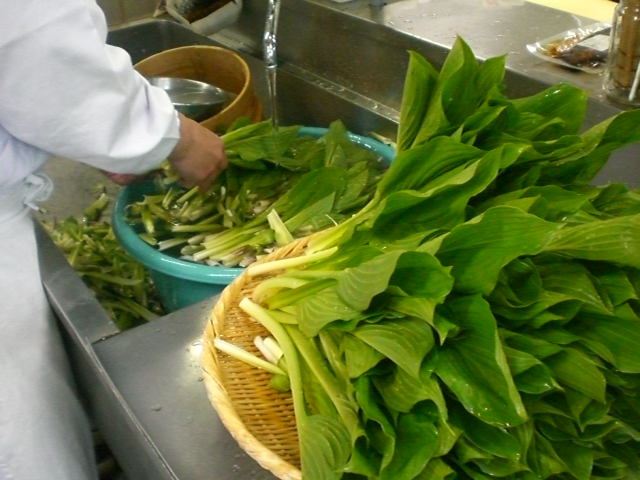 2009.04.24 ウルイ 環翠楼のイケメン風太くんが ダンボールにふっとつ(たくさん)ウルイを持ってきてくれました。 風太くんのおばあちゃんが丹精込めて作ったウルイ。 板長が早速今晩の料理の仕込を始めました。