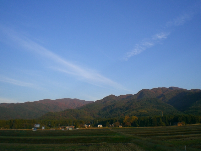 五頭の里から見える山々はすっかり赤くなりました。