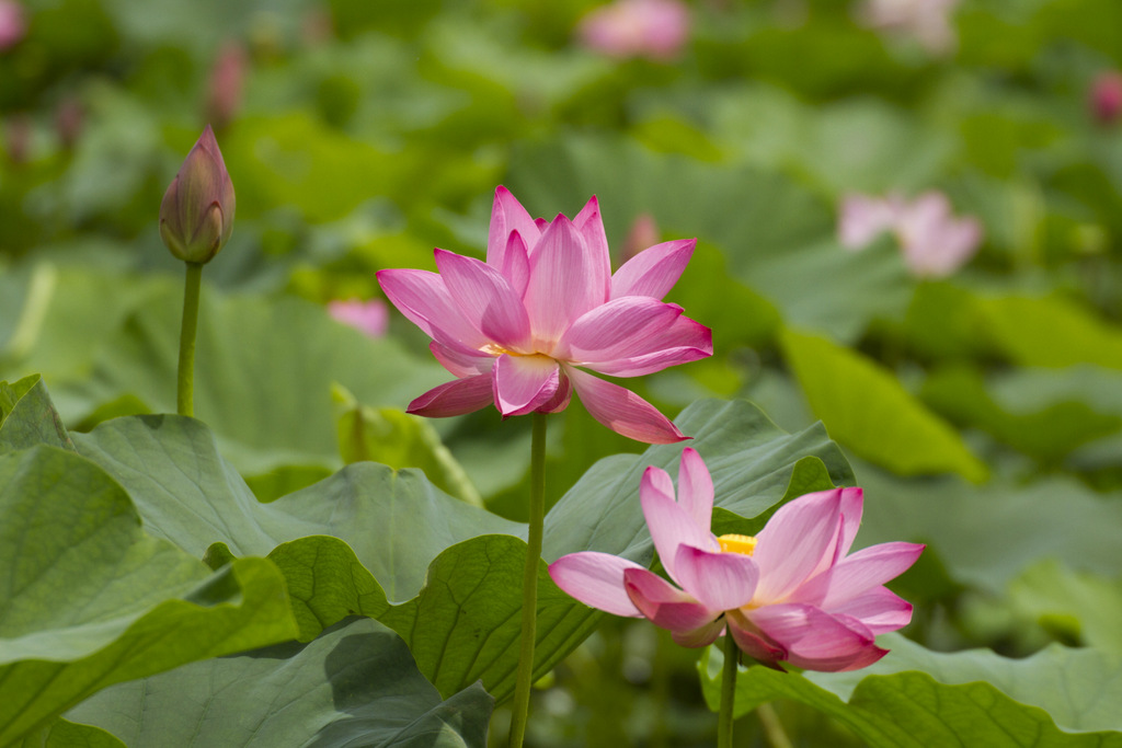 一面の緑色の中に引き立つハスの花の色。