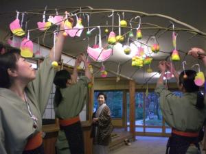 15日の小正月に向けて、繭玉飾りをしました。