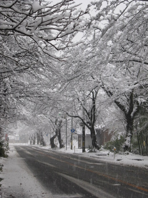 桜並木に雪が積もり、きれいです。