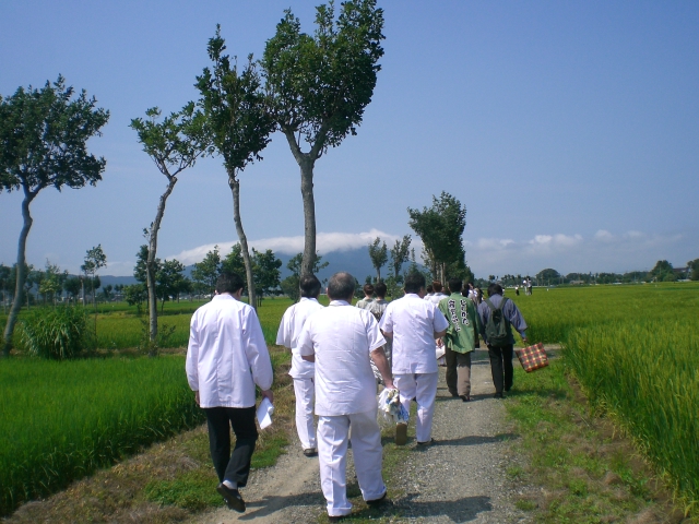 たんぼの真ん中を歩く人たち。